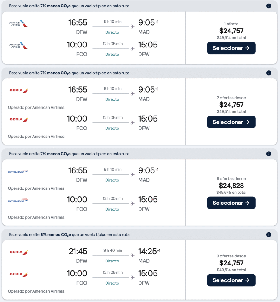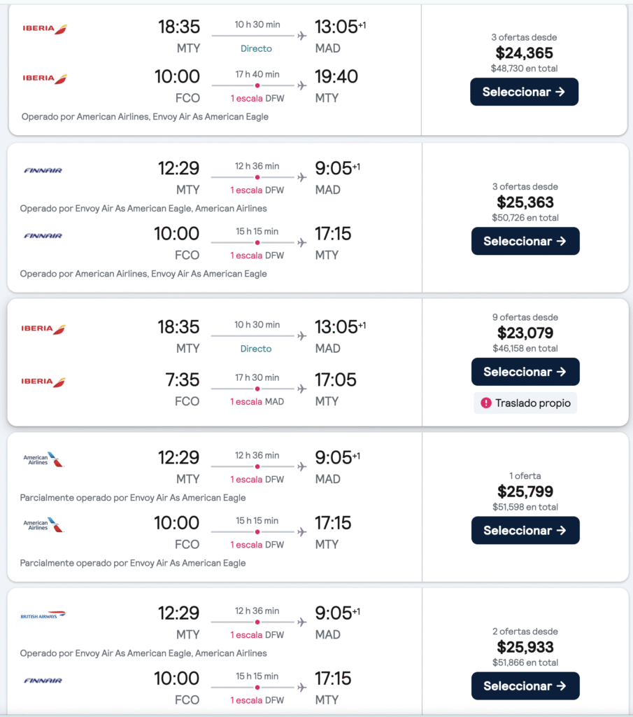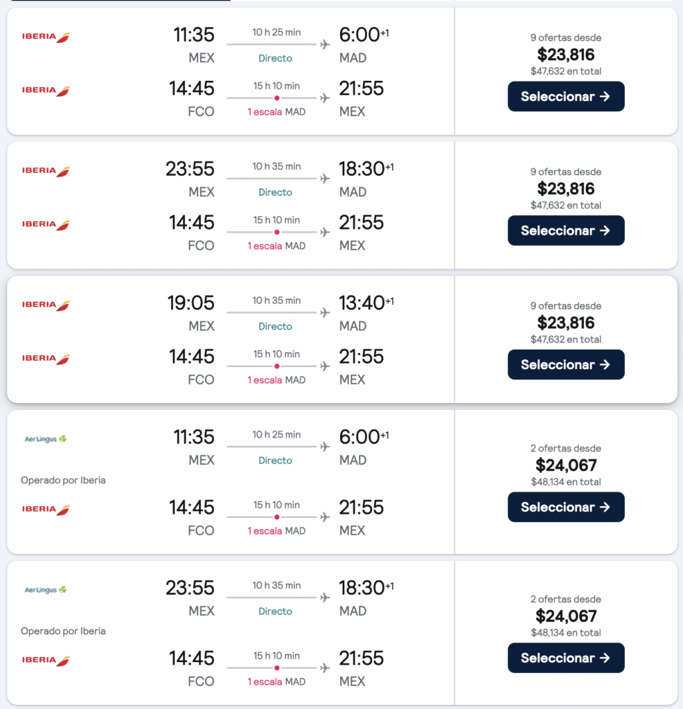México (CDMX) – Madrid y de regreso Roma-México (Todos tienen escala en Madrid al regresar). Considerar que hay que agregar el vuelo Monterrey – CDMX y de regreso